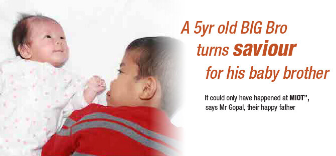The very next day, Aravind underwent next generation sequencing at MIOT- HLA (high resolution tissue typing)- which virtually eliminates a mismatch in stem cells at a later stage. Fortunately his elder brother, 5 year old Anand was found to be a perfect match. As both the patient & the donor were children, MIOT’s BMT specialists were joined by the expert Paediatric Team in the planning & execution of this highly specialized procedure. Firstly, all tests were done to ensure Anand’s safety and comfort. Next the Team aided by the latest medication and equipment, successfully collected stem cells directly from his peripheral veins, thereby avoiding a surgical procedure under anesthesia, as is normally done. “My brave, little son was perfectly okay at the end of the 4 hour exercise“, said his proud father.