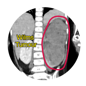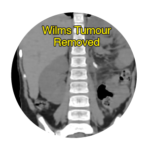 A 5 year-old girl presented with blood in the urine, an early but critical warning sign. Detailed investigations, including a CT scan and biopsy, confirmed the diagnosis of Wilms tumour, a rare but serious form of kidney cancer seen in children.