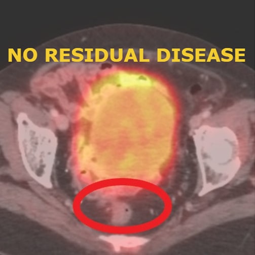 Significant tumour response that allowed the multidisciplinary tumour board to recommend a “watch-and-wait” approach, eliminating the need for surgery