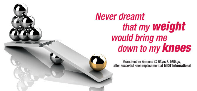 Ameena’s weight shift to 160kgswas so gradual that the family hardly related it to her knee pain & walking difficulties. These problems along with her diabetes were seen as part of the aging process. It was only when she sought help from one of them to walk or even stand up that her son woke up to the extent of the problem. After several futile visits to other centres, he brought her to MIOT International, Chennai on the recommendation of a close relative. “Thank God we came here or unknowingly we would have continued to put my mother through more pain” says her immensely relieved son.