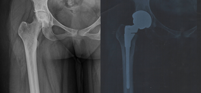 Patient has sickle cell anaemia. The blood cells in this disease are defective and they block the blood vessels. This can cause bone death. This lady had death of the bone in the right hip. She was unable to walk and was in severe pain.