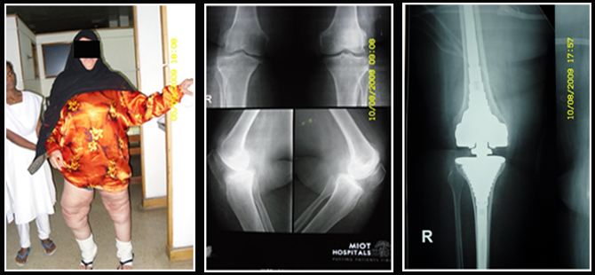 This 65 yr old lady came from Oman to MIOT because of arthritis and pain in the right knee and difficulty in walking due to her right knee bending outwards when she stood.